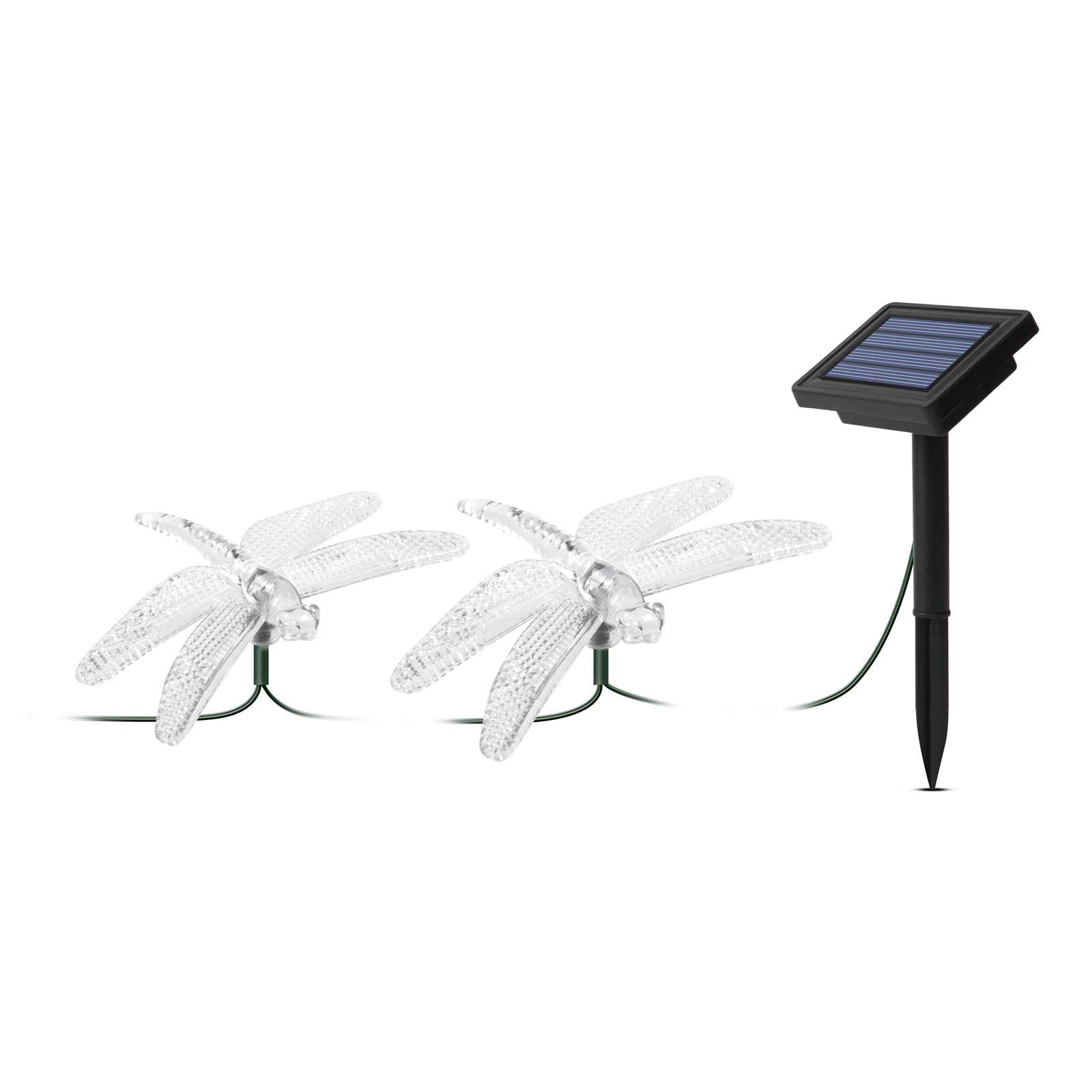10 db akril szitakötőből álló napelemes lámpa szett, amely varázslatos hangulatot teremt bármely kertben. Az átlátszó kis rovarok piros, sárga, kék, zöld LED-ek világítják meg, ezzel teremtve kellemes hangulatot hazaérkezéskor. A nap folyamán a szolár panel a napfényt elektromos árammá alakítja és feltölti a beépített akkumulátort. Szürkületkor a termék automatikusan bekapcsol, napfelkeltekor pedig ki. Idális lehet bármilyen kertben, bokrok, fák, virágoskertek egyedi és különleges dekorálására.